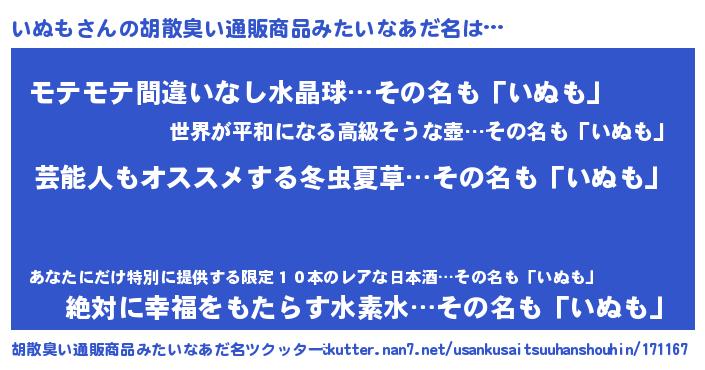 | 男性向けラノベタイトル風あだ名 | 『うちのいぬもが世界を掌握している!』 |
