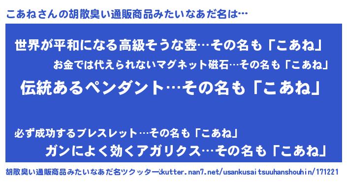 | 欧米人風あだ名 | 『ウサインこあね』『こあねクリステル』 |