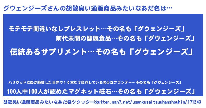 | 男性向けラノベタイトル風あだ名 | 『ダンジョンにグウェンジーズを求めるのは間違っているだろうか』 |
