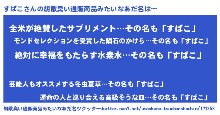 | 欧米人風あだ名 | 『アンジェラ・すばこ』『ウサインすばこ』 |