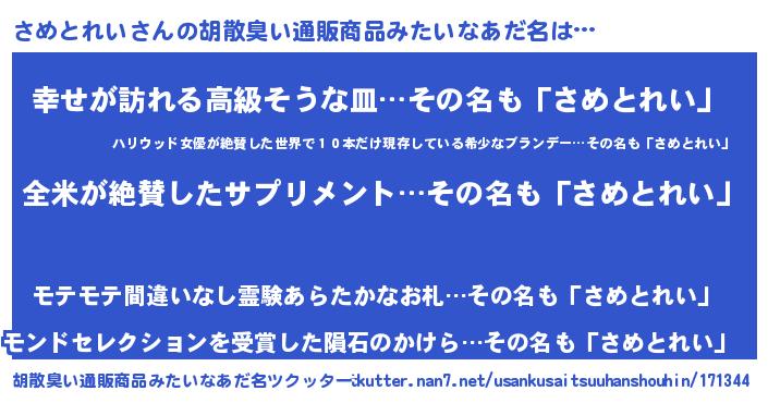 | 意味不明あだ名 | 『とにかく怪しいさめとれい』 |