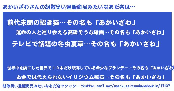 | 男性向けラノベタイトル風あだ名 | 『Re:あかいざわから始める異世界生活』 |