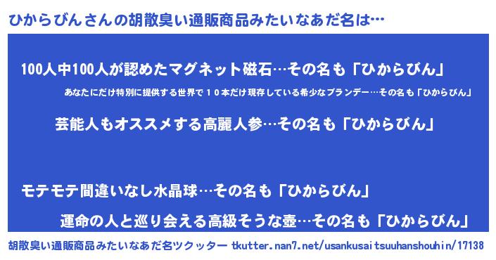 | 男性向けラノベタイトル風あだ名 | 『ひからびんに滅ぼされるだけの簡単なお仕事です』 |
