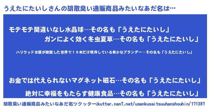 | 意味不明あだ名 | 『住所不定無職うえたにたいし(81歳)』 |