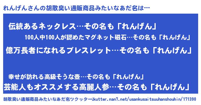 | 意味不明あだ名 | 『ペロリンれんげん』『自称れんげん』 |