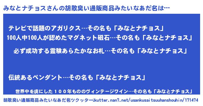 | 男性向けラノベタイトル風あだ名 | 『みなとナチョスの憂鬱』 |