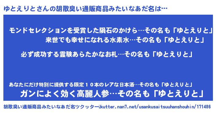 | ヘコむあだ名 | 『ゆともー』『ゆとえりと(震え声)』 |
