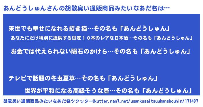| ヘコむあだ名 | 『あんどうしゅん(苦笑)』『なまこ酢』 |