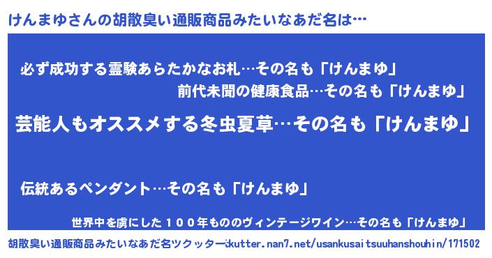 | 意味不明あだ名 | 『自称けんまゆ』『ペロリンけんまゆ』 |