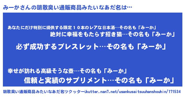 | 男性向けラノベタイトル風あだ名 | 『みーかの憂鬱』『魔弾の王とみーか』 |