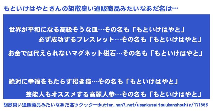 | 男性向けラノベタイトル風あだ名 | 『おまえをオタクにしてやるから、俺をもといけはやとにしてくれ! 』 |