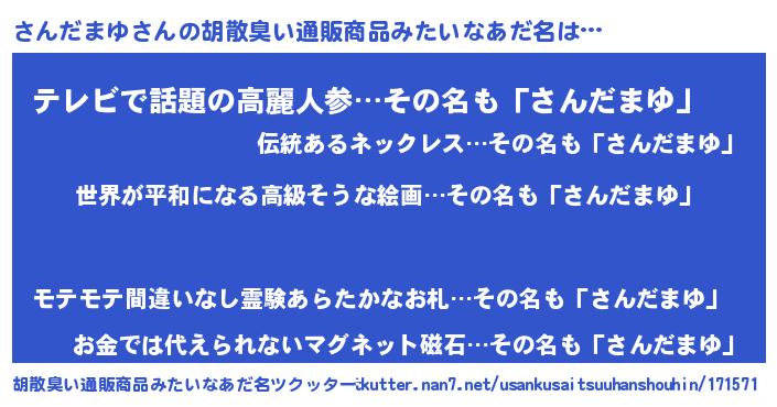 | 男性向けラノベタイトル風あだ名 | 『転生したらさんだまゆだった件』 |