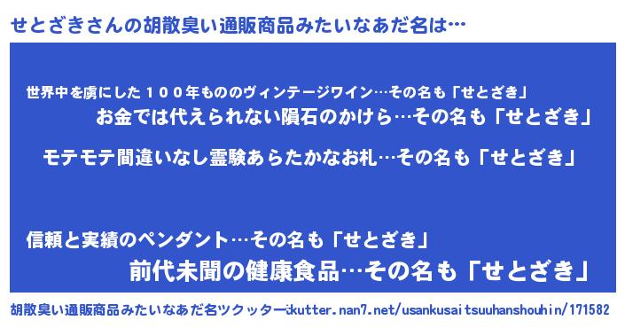 | 男性向けラノベタイトル風あだ名 | 『せとざきの憂鬱』『セトザキスレイヤー』 |
