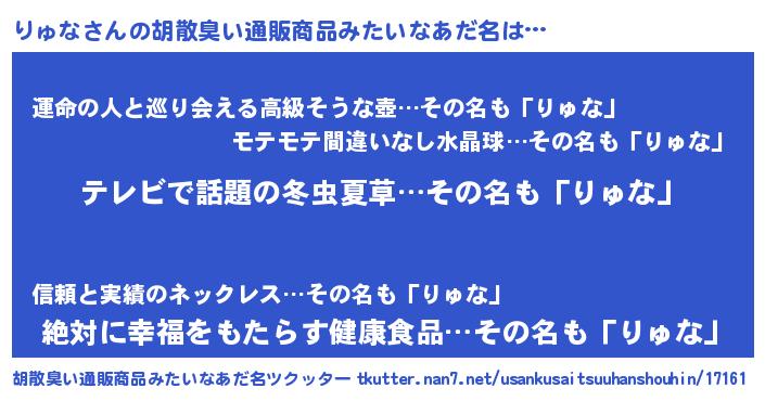 | 男性向けラノベタイトル風あだ名 | 『Re:りゅなから始める異世界生活』 |