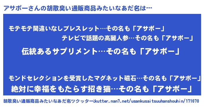 | ヘコむあだ名 | 『アサを』『アサもー』『酢こんぶ』 |