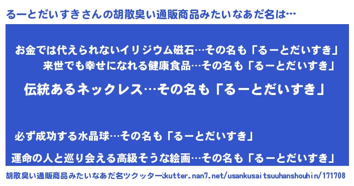 | 男性向けラノベタイトル風あだ名 | 『るーとだいすきの嫁は女の子じゃないと思った?』 |