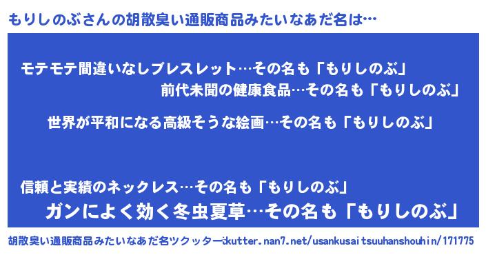 | 男性向けラノベタイトル風あだ名 | 『もりしのぶに滅ぼされるだけの簡単なお仕事です』 |