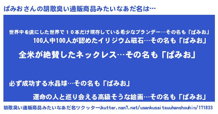 | 意味不明あだ名 | 『とにかく怪しいぱみお』 |