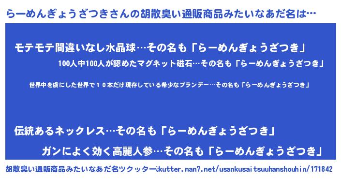 | 意味不明あだ名 | 『住所不定無職らーめんぎょうざつき(77歳)』 |