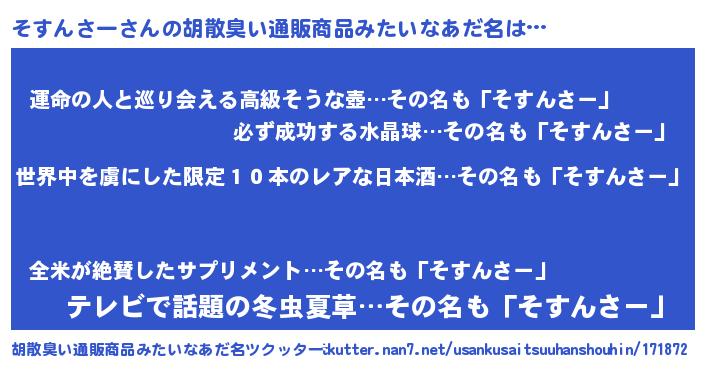 | 意味不明あだ名 | 『住所不定無職そすんさー(65歳)』 |