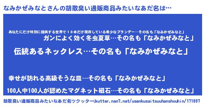 | 男性向けラノベタイトル風あだ名 | 『ダンジョンになみかぜみなとを求めるのは間違っているだろうか』 |