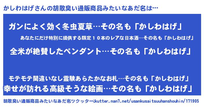 | 恥ずかしいあだ名 | 『カシリンリン』『カシワハゲデラックス』 |