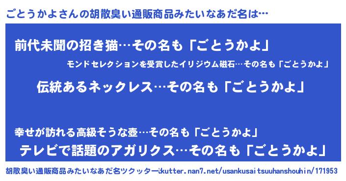 | 男性向けラノベタイトル風あだ名 | 『転生したらごとうかよだった件』 |