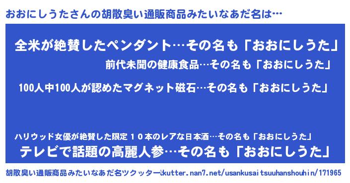 | 男性向けラノベタイトル風あだ名 | 『オオニシウタスレイヤー』 |