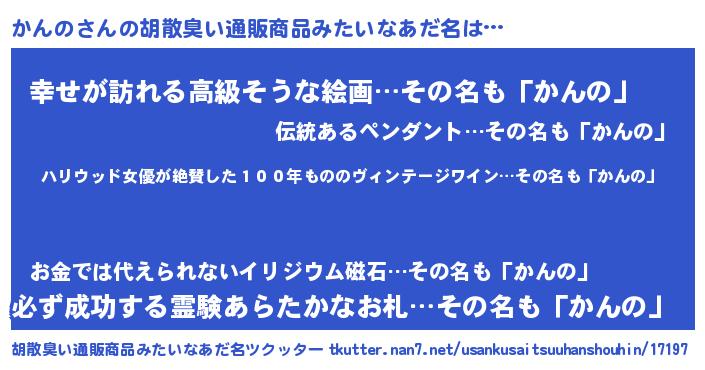 | 意味不明あだ名 | 『住所不定無職かんの(6歳)』 |