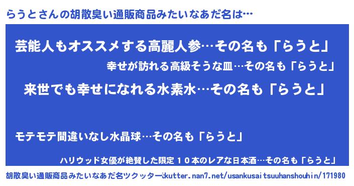 | 意味不明あだ名 | 『永久保存らうと』『自称らうと』 |