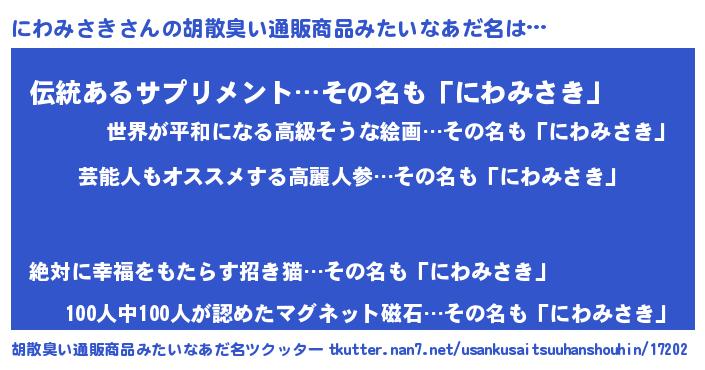 | 意味不明あだ名 | 『自称にわみさき』『永久保存にわみさき』 |
