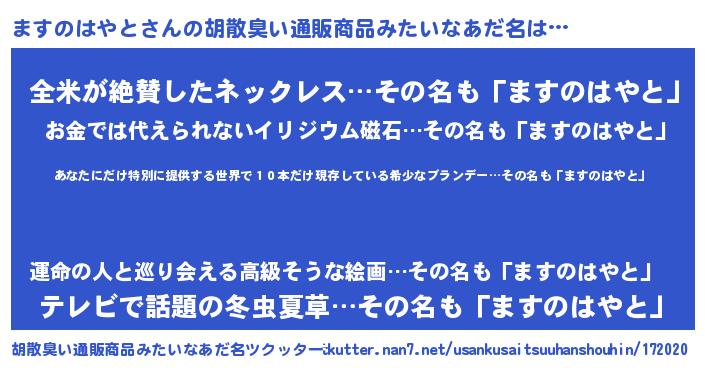 | 意味不明あだ名 | 『住所不定無職ますのはやと(79歳)』 |