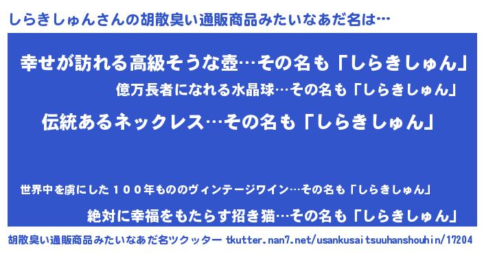 | 男性向けラノベタイトル風あだ名 | 『しらきしゅんの嫁は女の子じゃないと思った?』 |