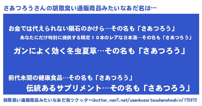| 意味不明あだ名 | 『自称さあつろう』『永久保存さあつろう』 |