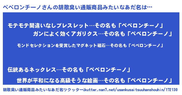 | 男性向けラノベタイトル風あだ名 | 『ノーゲーム・ノーペペロンチーノ』 |