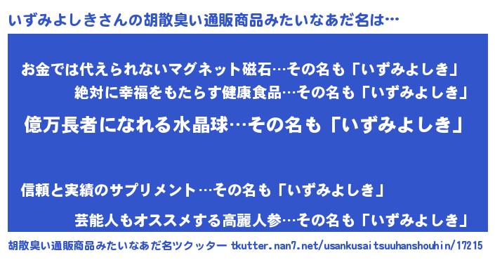 | ヘコむあだ名 | 『いずにゅー』『いずみよしき(笑)』 |