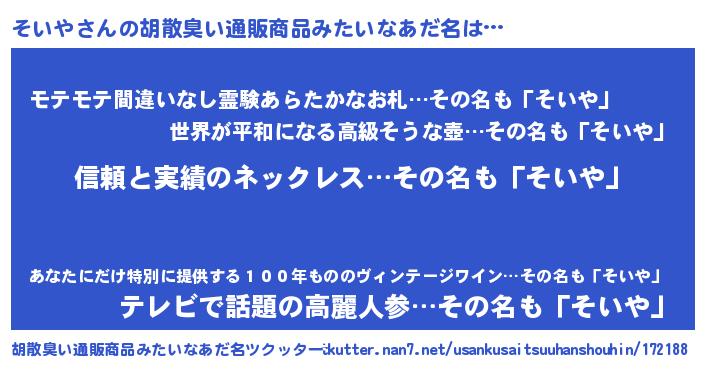 | 男性向けラノベタイトル風あだ名 | 『ソイヤスレイヤー』『そいやの憂鬱』 |