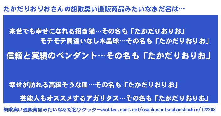 | 欧米人風あだ名 | 『ウサインたかだりおりお』 |