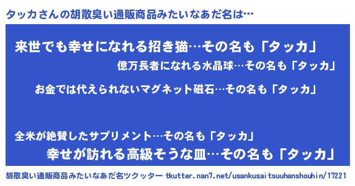 | 男性向けラノベタイトル風あだ名 | 『タッカに滅ぼされるだけの簡単なお仕事です』 |