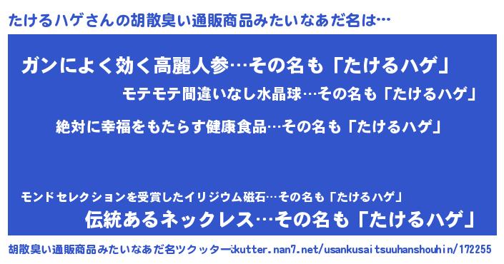 | 意味不明あだ名 | 『永久保存たけるハゲ』『自称たけるハゲ』 |