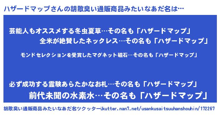 | 男性向けラノベタイトル風あだ名 | 『うちのハザードマップが世界を掌握している!』 |