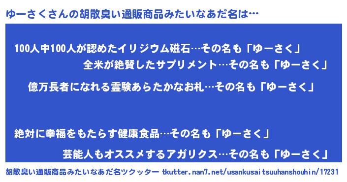 | 意味不明あだ名 | 『ペロリンゆーさく』『自称ゆーさく』 |
