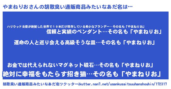 | 男性向けラノベタイトル風あだ名 | 『やまねりおに滅ぼされるだけの簡単なお仕事です』 |