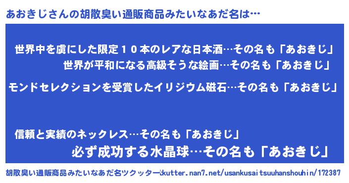 | 男性向けラノベタイトル風あだ名 | 『あおきじに滅ぼされるだけの簡単なお仕事です』 |