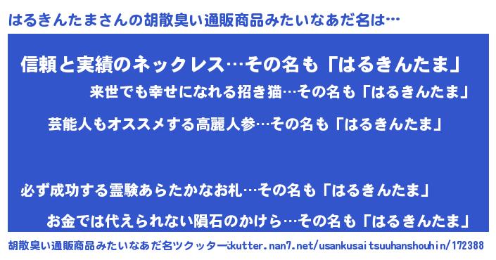 | 男性向けラノベタイトル風あだ名 | 『はるきんたま~年齢イコール彼女いない歴の魔法使い~』 |