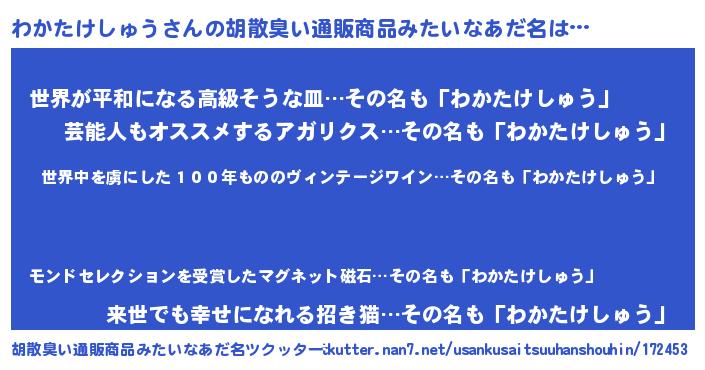 | 男性向けラノベタイトル風あだ名 | 『転生したらわかたけしゅうだった件』 |