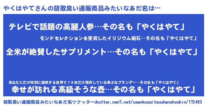 | ヒーロー風カッコイイあだ名 | 『天弓騎士ヤク』『愛の使者やくはやて』 |