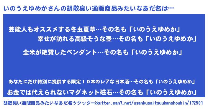 | 男性向けラノベタイトル風あだ名 | 『いのうえゆめかの嫁は女の子じゃないと思った?』 |