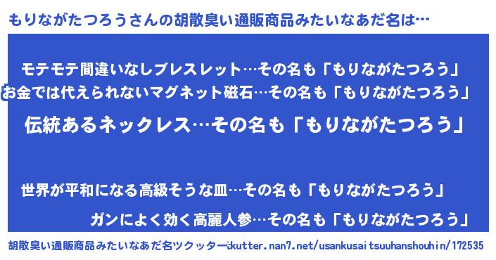 | 男性向けラノベタイトル風あだ名 | 『転生したらもりながたつろうだった件』 |