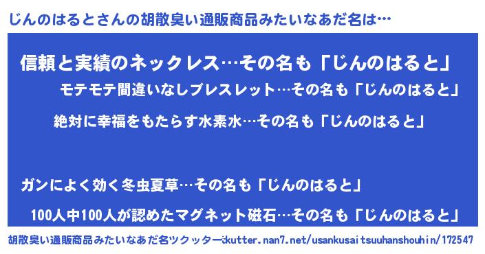 | 男性向けラノベタイトル風あだ名 | 『じんのはるとという概念が存在しない退屈な世界 』 |